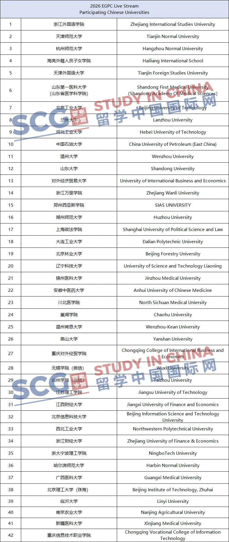 A total of 42 Chinese universities will join the EGPC live stream, of which about 20 universities will enter the SCG live stream. The list is random.