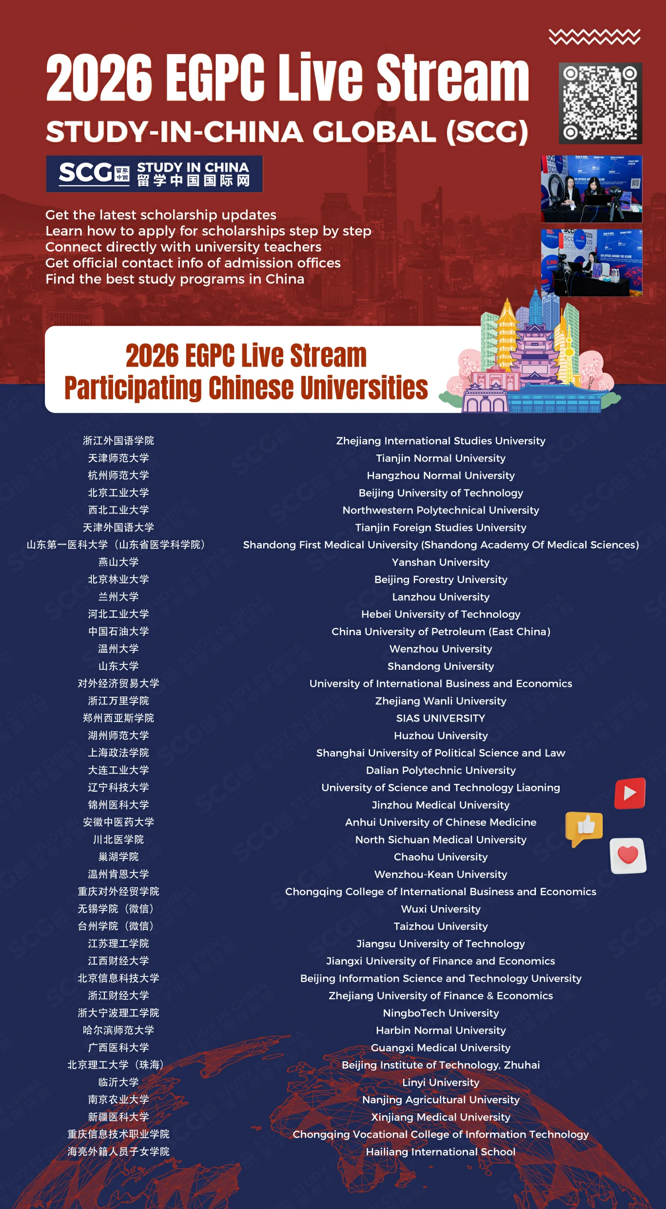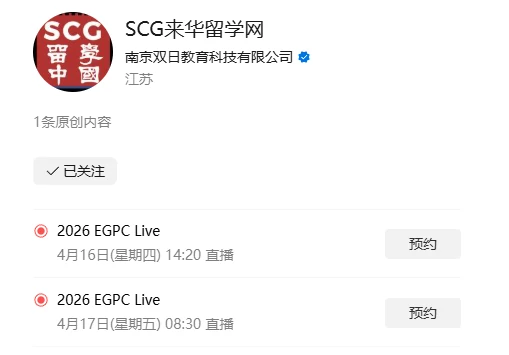 At this EGPC conference, Study in China Global(SCG) will host a two-day live stream, with an estimated 20 Chinese universities joining SCG’s broadcast room. You can directly click the card below to reserve the live stream!